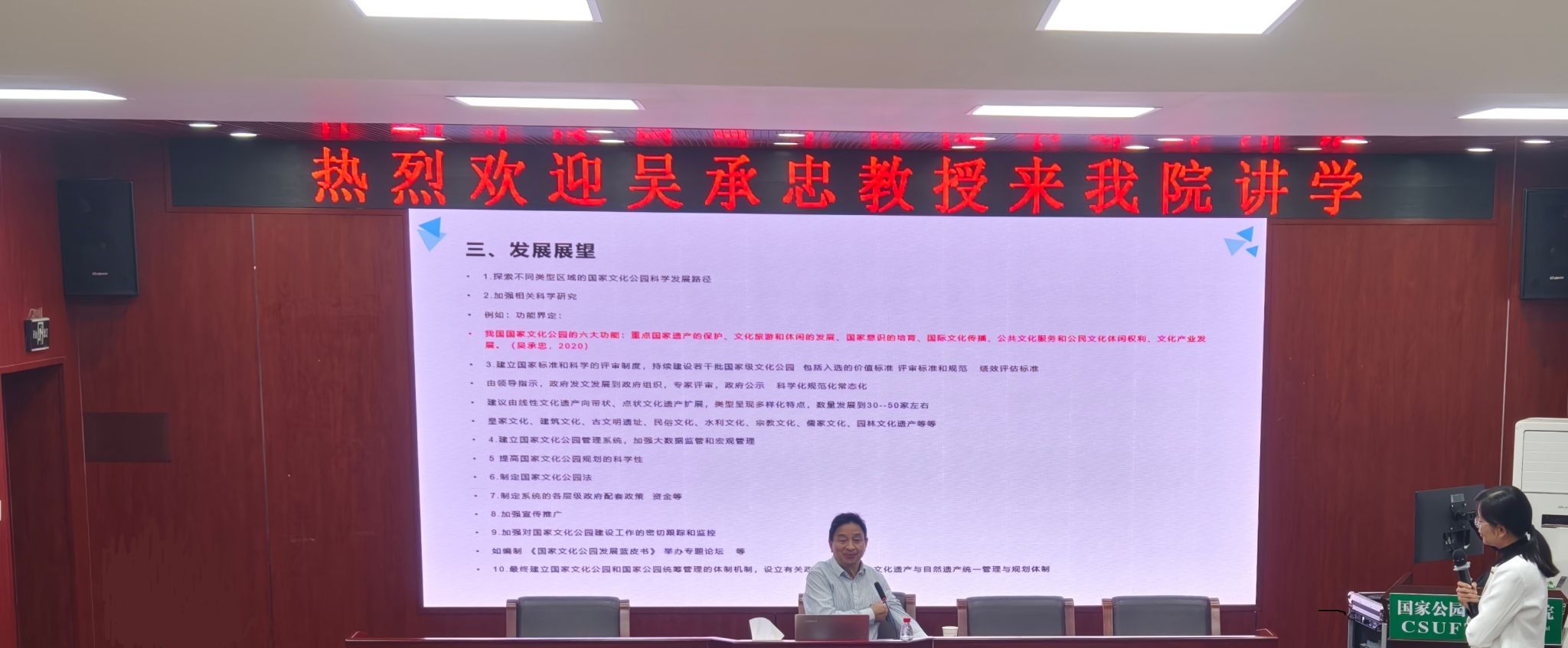 首先,徐美致欢迎辞并强调该领域研究的重要性。 然后,吴承忠围绕主题深入阐述了国家文化公园研究进展、建设与体制、文化资源开发与规划,以及建设现状评估与展望等。 最后,吴承忠对老师们关于国家社科基金申报、国家公园建设与管理专业优化等方面的提问给出了前瞻性和实用性建议。
