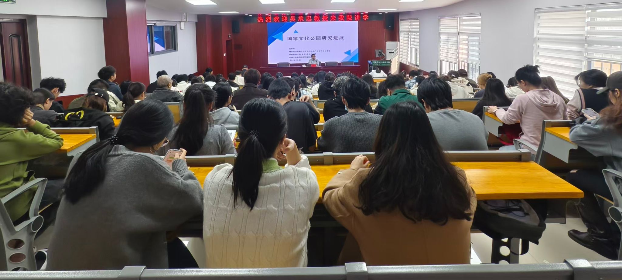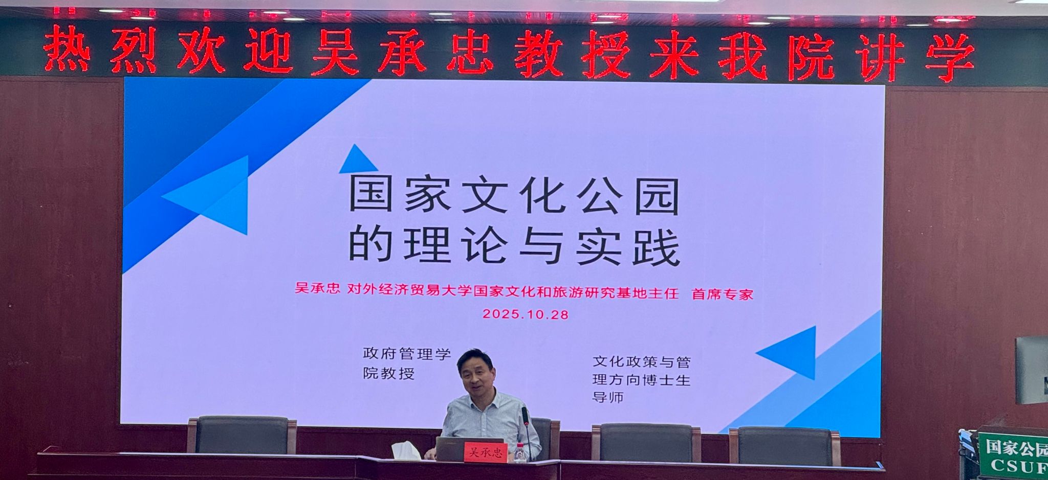 10月28日下午,学院在博文楼南905室成功举办学术讲座“国家文化公园的理论与实践”。讲座由对外经济贸易大学教授博导、文旅部文化和旅游研究基地主任、首席专家吴承忠主讲,学院副院长徐美主持,近百名师生参加学习。