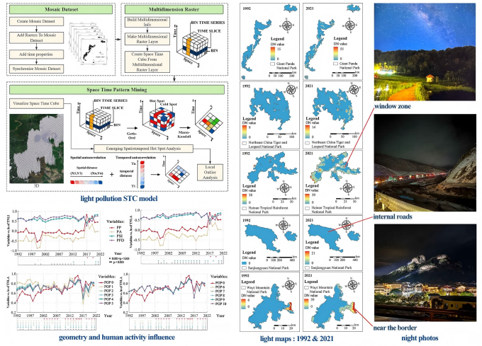 光污染已成为全球生物多样性和生态健康的重要威胁。作为夜空和生态系统最后的避难所,国家公园等自然保护地也日益受到光污染的影响。本研究利用时空立方体模型,揭示了中国五个国家公园(大熊猫、东北虎豹、海南热带雨林、三江源、武夷山)自1992年至2021年的长时间光污染时空分布规律及其驱动因素。