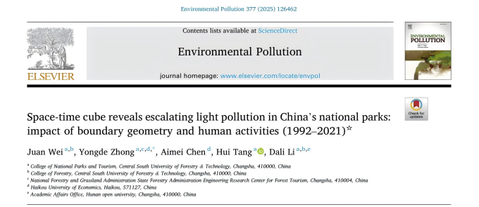 引用链接:Wei, J., Zhong, Y., Chen, A., Tang, H., & Li, D. (2025). Space-time cube reveals escalating light pollution in China's national parks: impact of boundary geometry and human activities (1992–2021). Environmental Pollution, 126462. https://doi.org/10.1016/j.envpol.2025.126462