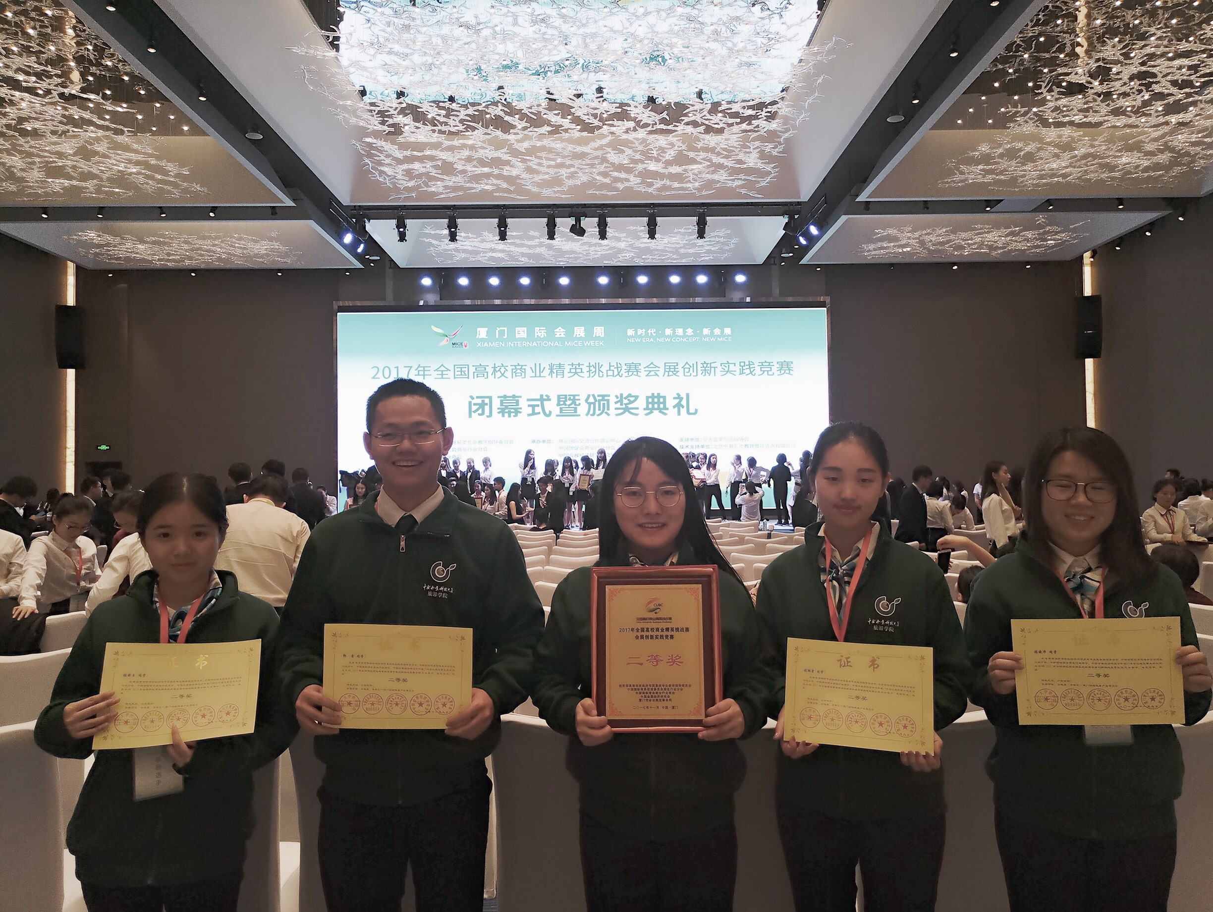 我校代表队“MICE咖”最终以《“云健康,享智汇”2018厦门国际健康产业博览会策划书》斩获全国二等奖,指导教师获得最佳指导教师。团队由会展经济与管理专任教师林梓指导,由2016级会展经济与管理专业钱妙、张晓华、张婷玉、张琬童,2016级旅游管理信息化方向郭鑫五位同学组成。