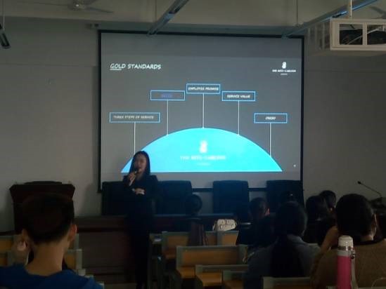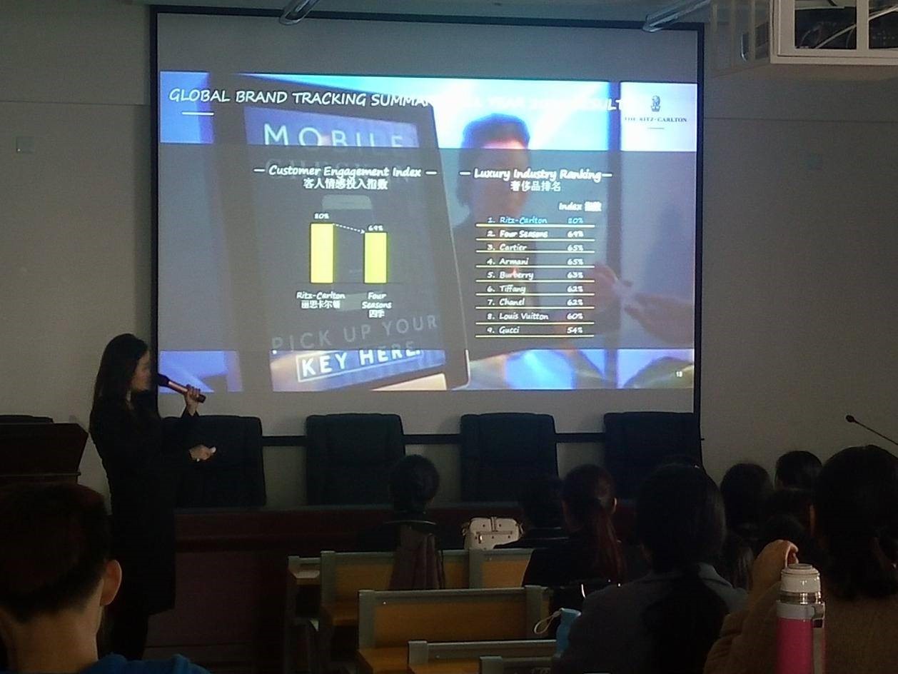 首先,陈总监向学生介绍丽思卡尔顿酒店的历史以及酒店的服务理念。万豪集团于2016年9月完成了对喜达屋酒店及度假酒店国际集团的收购,自此作为拥有30个子品牌,5700家酒店的万豪酒店集团当之无愧成为全球最大的酒店集团。丽思卡尔顿酒店以其经典奢华在万豪酒店集团中成为了一个顶尖的存在。通过陈总监的宣讲,同学们对丽思卡尔顿有了深入的了解。成立于1889年的丽思卡尔顿酒店迄今为止在全球已拥有90家丽思卡尔顿酒店,截至2017年将有33家新酒店开业。 “Our Ladies and Gentlemen might not have the wealth,knowledge,or education of our guests,but they do have the same values.”