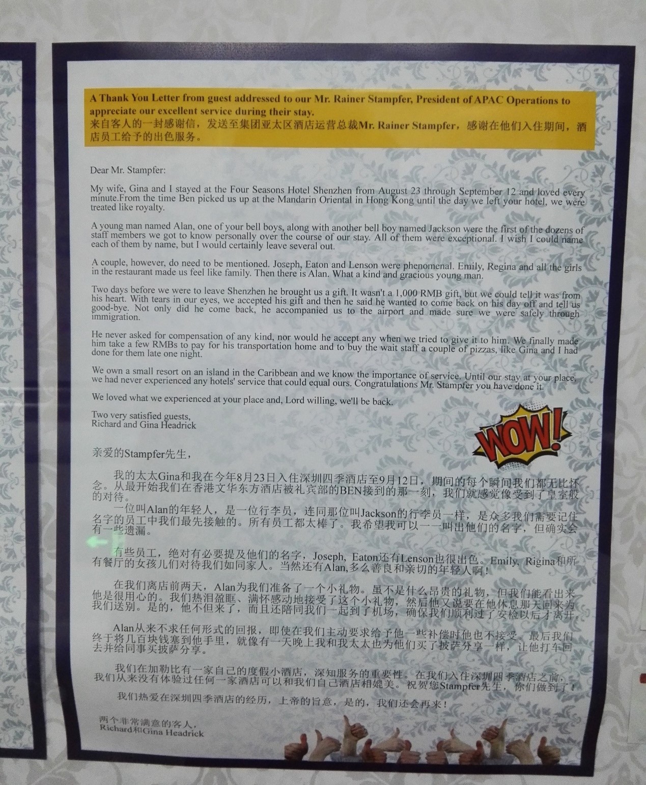 孙晓同学在深圳四季酒店礼宾部实习,近期酒店管理层收到转发至四季酒店集团亚太区酒店运营总裁的顾客表扬信,并张贴在员工公告栏给予表扬。客人Richard and Gina Headrick 在信中对孙晓同学(Alan)在客人入住期间的出色服务表示感谢,并把表扬信发了四季酒店集团亚太运营总裁Mr. Rainer Stampfer。