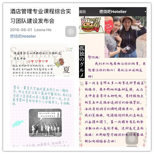 本次实习是完全由我们自愿分组,选出组长,进行各自的工作。这就给平常不熟悉没有很多机会交流的同学一个共同工作的机会,互相帮助、了解彼此。作为组长,不仅要对小组的所有任务有一个全面的认识,还要根据组员的性格特点及特长划分任务。组长肩负着整个组实习成绩的责任,在组员出现倦怠时要及时督促,在组员出现难以解决的问题,及时与团队指导老师进行沟通,想办法解决。在组内产生意见不合时,组长要学会协调,凝聚组员的力量,向更好的方向发展。挖掘每一位组员的擅长点,让其负责相应的工作,让其特长更好的发挥。小组内部及时沟通,集思广益,合理分工,让每一次微信平台的推送都集合着全体成员的努力和智慧,让整个小组更加和谐融洽。经过沟通和磨合,我们彼此反思,尝试着了解其他小组工作的困难,理解他们的努力和付出,愿意相信下一次会更好,愿意彼此鼓励彼此支持。