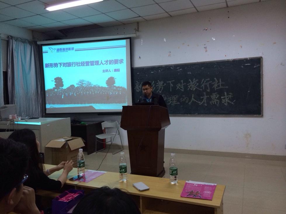 3月26日晚,旅游学院举办的“‘舞动’森游,政府行业精英校园行”专题讲座活动邀请到了我校2003级校友、湖南海外旅游有限公司的同业中心总经理唐船先生。在华天实训楼二楼,唐船为师生做了题为“新形势下对旅行社经营管理人才的要求”的专题讲座。