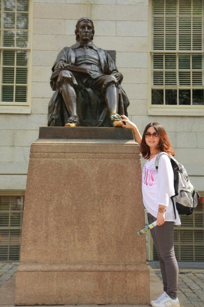 赵月在哈佛大学第一任校长约翰哈佛塑像前照片