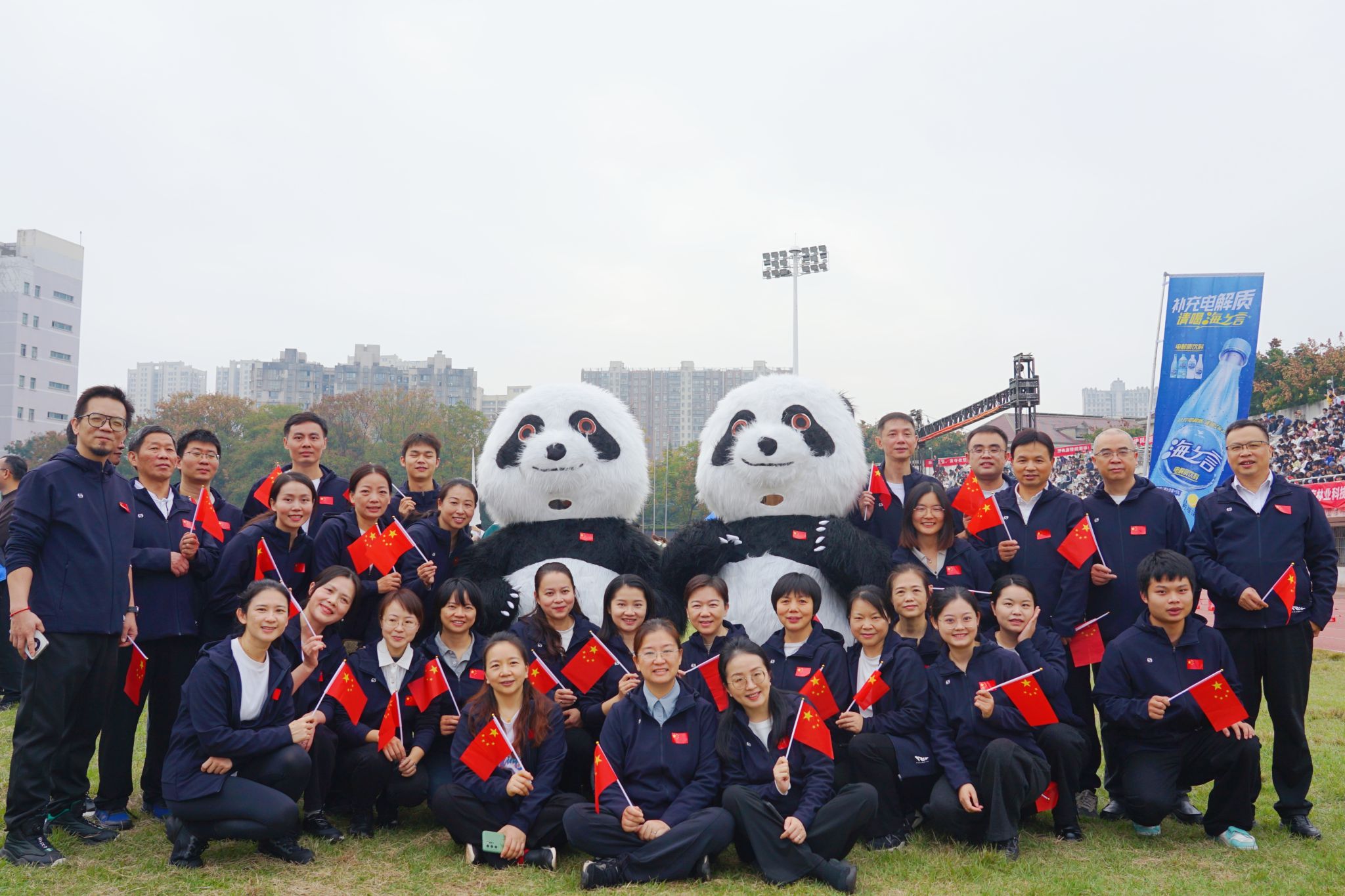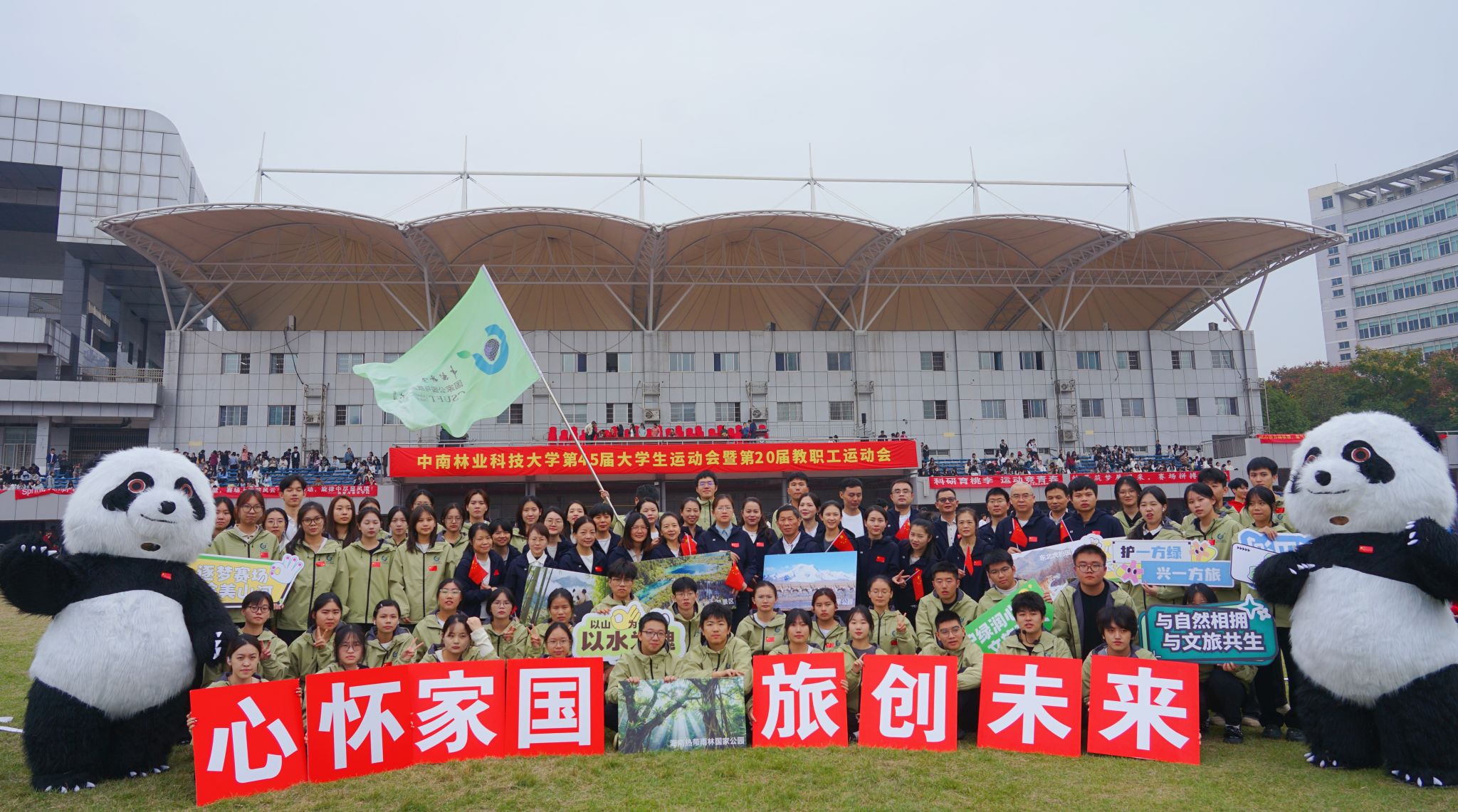 开幕式方阵出场环节,我院以独特的创意展现了学院特色与精神风貌。同学们身着统一的竹绿色服装,如同一片生机盎然的绿竹,呼应着保护生态的理念;两只憨态可掬的熊猫卡通服玩偶灵动穿梭,为方阵增添了十足活力;“生态铸魂,运动筑梦,心怀家国,旅创未来”的口号铿锵有力,喊出了我们的理想与担当。胸前的国旗贴纸熠熠生辉,老师们手中的小红旗迎风招展,观众席的同学们齐声呐喊与方阵互动,那一刻,家国情怀与集体荣誉感在赛场之上深深交融。