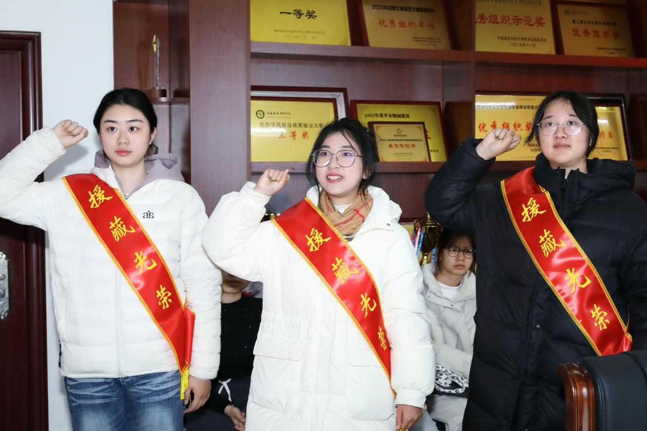 仪式上,洪梅、洪晶波为即将出征的梁晓瑞、张雁、杨舒晴三位同学佩戴荣誉绶带、授予出征横幅。全体队员在魏昕老师的带领下庄严宣誓。出征前的座谈交流环节,老师们耐心叮嘱工作与生活中的注意事项,有援藏经验的老师结合自身经历,向实习队员细致讲解工作内容、给予针对性指导,重点强调了高原环境下纪律意识、安全规范与跨文化沟通的重要性,勉励大家在服务边疆的实践中锤炼本领、厚植家国情怀。