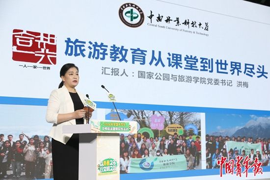 6月21日,“以青春之名 行文明之旅”——2024年全国大学生文明旅游暑期实践活动启动仪式现场,中南林业科技大学国家公园与旅游学院党委书记洪梅分享该校文明旅游教学实践故事。中青报·中青网记者 陈剑/摄