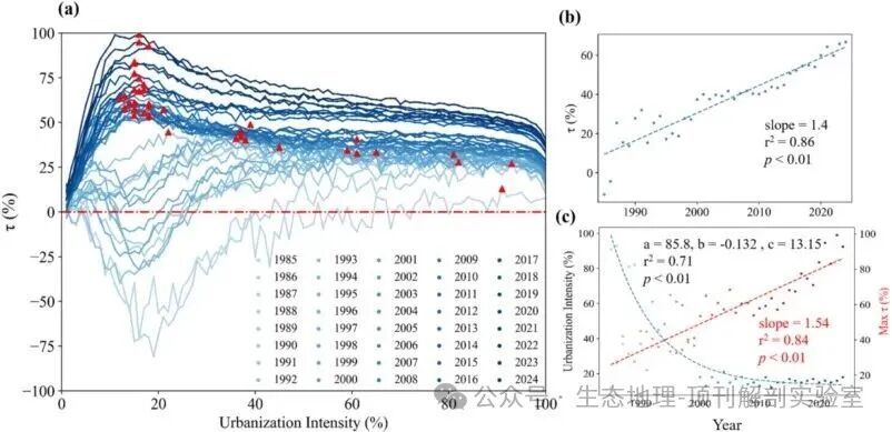 3. 一个重要的发现是,达到最大τ值所需的UI阈值呈现指数下降趋势,并在2000年后趋于稳定,这说明城市发展模式可能从早期的粗放扩张转向了更注重生态效益的集约发展。