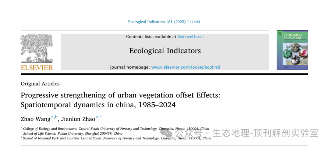 Ecological Indicators近期发表题为“Progressive strengthening of urban vegetation offset Effects: Spatiotemporal dynamics in china, 1985-2024”的文章。第一单位为中南林业科技大学。