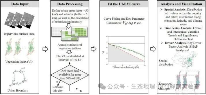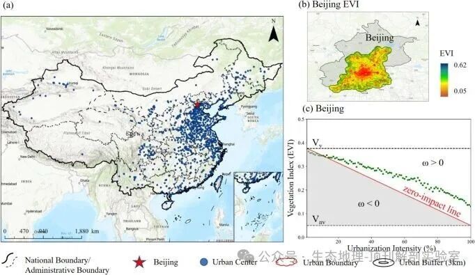 为了量化这两种影响,作者构建了“城市化强度-EVI”关系图。城市化强度(UI)定义为1km²网格内不透水面的面积比例,从0(完全植被)到1(完全不透水)。