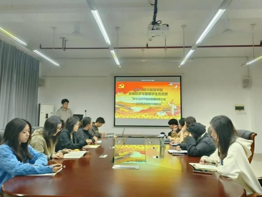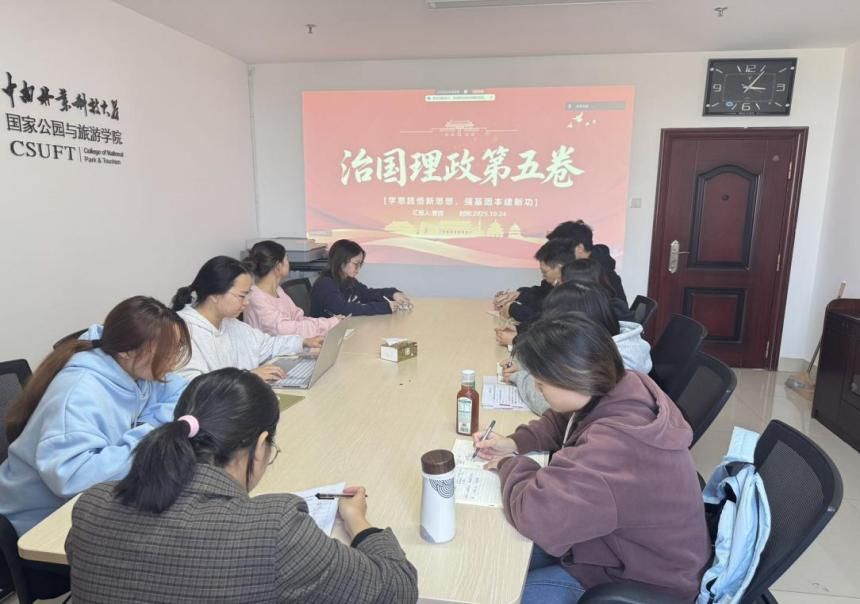 2025年10月24日,国家公园与旅游学院生态旅游学生党支部在博文楼北1108举行“学思践悟新思想,强基固本建新功”主题党日学习教育活动,深入学习《习近平谈治国理政》第五卷,深刻把握习近平新时代中国特色社会主义思想的丰富内涵和实践要求,旨在引导广大党员坚定理想信念,增强党性修养。会议由支部书记黄玲同志主持,支部全体党员参加。