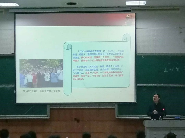 第二节课是由马克思主义学院的周预分老师讲授的“积极培育和践行社会主义核心价值观纪录片”。老师分别从“为什么要积极培育和践行社会主义核心价值观”,“如何深刻理解二十四字的社会主义核心价值观”以及“怎样做社会主义核心价值观的积极培育和践行者”三个方面进行阐述。