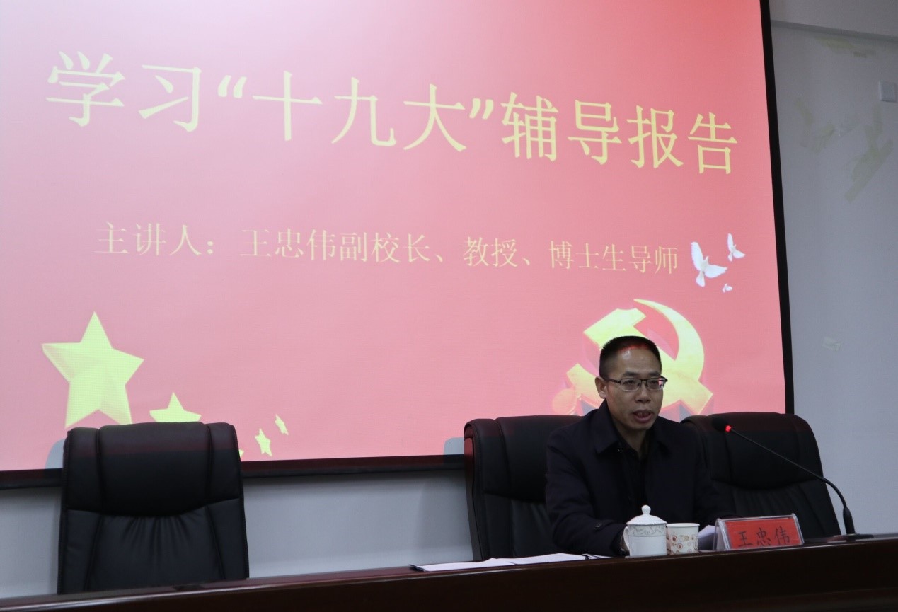 2018年1月4日下午,校党委委员、副校长王忠伟同志在文综楼南905为旅游学院和体育学院全体教师党员和学生党员代表作了学习党的“十九大”辅导报告。报告从历史经度、世界纬度深刻地阐述了习近平总书记的新时代中国特色社会主义思想,为师生党员上了一堂生动精彩的党课。
