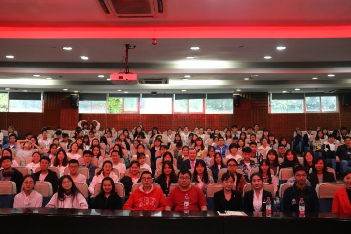 讲座开始,何恩儒先生在 PPT 上展示了顺序混乱的中南林业科技大学英文拼写,向同学们提问,启发同学们用左脑思考问题。随后,何恩儒先生给在场同学讲述了一个故事,后向同学们提问故事中的细节问题,同学们踊跃问答问题,现场气氛融洽。何恩儒先生告诉同学们问问题的三步骤,一是问,二是聆听,三是理解。何恩儒先生分享了他自己的工作经历,洗碗端盘、餐饮部盘点库存、沙特阿拉伯总经理、南美区域副总裁等等,从中他学会了勤学好问,处理事情时怎样从具体的框架中抽身出来全面的看问题。同时,何恩儒先生提到一个职场人应做到高度的自律,多多关注家人、思想、体格、健康,保证工作的顺利进行。紧接着何恩儒先生用两根质地不同钢笔以及世界知名的洗衣粉制造商向同学们引出品牌的含义,说明形象和品牌联系在一起。何恩儒先生用自身经历告诉同学们,当人生走到“T”字或丁字路口时,要坚定自己的选择,有梦想未来一切皆可能。现场进入提问环节,两位同学提问,何恩儒先生耐心解答。最后,全体老师同学和何恩儒先生拍大合照,现场气氛融洽。