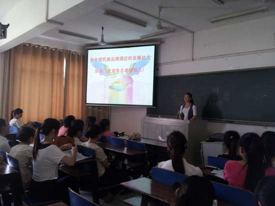 首先,苏经理给大家介绍了华天集团的基本概况,以及作为旗舰店的基本特色,随后就华天总店近年来所获荣誉与在坐学子做了分享。接着,苏经理就酒店接收学生实习就业的优势以及目前市场所需求的酒店人才应具备的素质等方面做了详细讲述。其后,我院上年度在该酒店参加实习的2010级酒店管理专业学生姚玉凤今年3月实习期结束和酒店签订劳动合同继续留在酒店发展,给同学们以学姐的身份分享了工作中的酸甜苦辣,与学弟学妹们交流心得,给大家的实习就业疑惑做了一一解答。