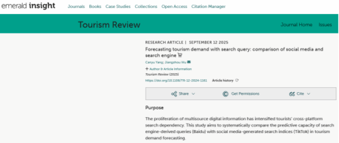 近日,由我院2023级旅游管理专业硕士生杨璨宇(第一作者)与吴江洲副教授(通讯作者)合作完成的研究论文“Forecasting tourism demand with search query: comparison of social media and search engine”在旅游领域权威期刊《Tourism Review》正式发表。《Tourism Review》创刊于1947年,是最早设立专门讨论旅游问题的学术期刊,2024年影响因子为7.9,为JCR一区、中科院管理学二区TOP期刊。