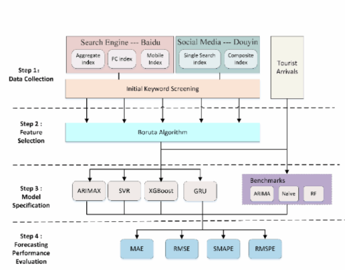 随着互联网信息的日益丰富,游客的搜索行为呈现出多源化趋势。本研究旨在探讨社交媒体搜索数据(以抖音为例)对旅游需求预测准确性的提升效果,并与传统搜索引擎数据(以百度为例)进行预测性能比较。以中国西部重要旅游目的地九寨沟景区作为主要案例,同时使用四姑娘山景区进行稳健性检验。研究采用Boruta算法对不同类型搜索数据进行特征选择,并基于不同原理的预测模型与多源搜索数据,对每日游客量进行预测及精度验证。研究发现,在搜索引擎数据中,百度移动指数的预测表现显著优于其他类型指数;而在社交媒体数据中,抖音单一搜索指数的预测效果略优于综合指数。在使用AI模型时,社交媒体搜索数据的预测效果与搜索引擎数据相当甚至更优。然而,整合多源搜索数据对预测精度的提升作用较为有限。