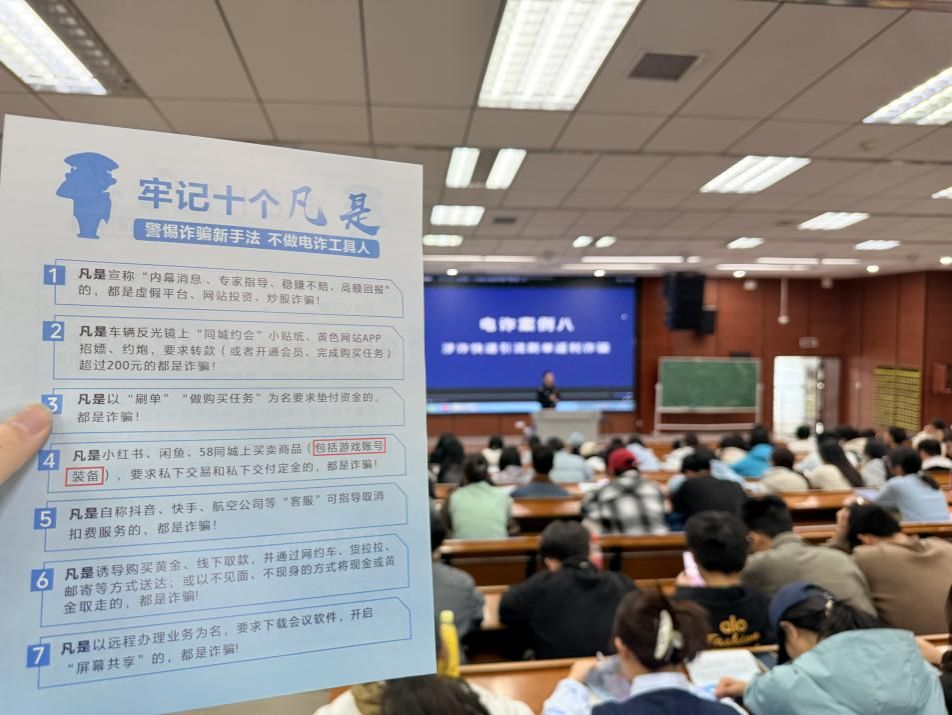 12月19日我院于博文楼北304开展反诈讲座,主讲人长沙市天心公安分局文员派出所所长刘谋千警官通过描述真实事件还原诈骗分子的完整作案链条。同时揭示了其他高发诈骗类型:冒充客服以"订单异常"为由诱导退款的骗局中,骗子会发送虚假退款链接套取银行卡信息;以小商品为幌子随单寄送“红包|中奖”纸条吸引消费者点击陌生链接,进行钱财的骗取;而校园贷、京东白条,花呗衍生的"注销账号"骗局,专门针对学生群体谎称"不注销会影响征信",实则骗取身份信息和验证码。这些案例均通过情景再现的方式,展示了诈骗分子如何利用受害者的情感弱点、信息差和法律盲区实施精准诈骗。