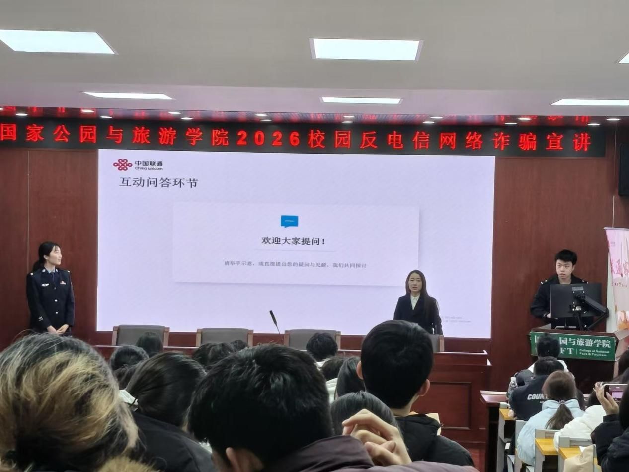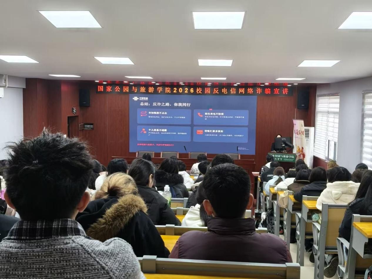 为切实筑牢校园安全屏障,提升学生防范电信网络诈骗意识与自我保护能力,有效遏制校园诈骗案件发生,2026年3月9日,国家公园与旅游学院在博文楼南905教室举办校园反电信网络诈骗专题宣讲活动。本次活动由长沙联通反诈宣讲专员主讲,辖区民警到场指导,学院组织25级118名班委共同参加学习。