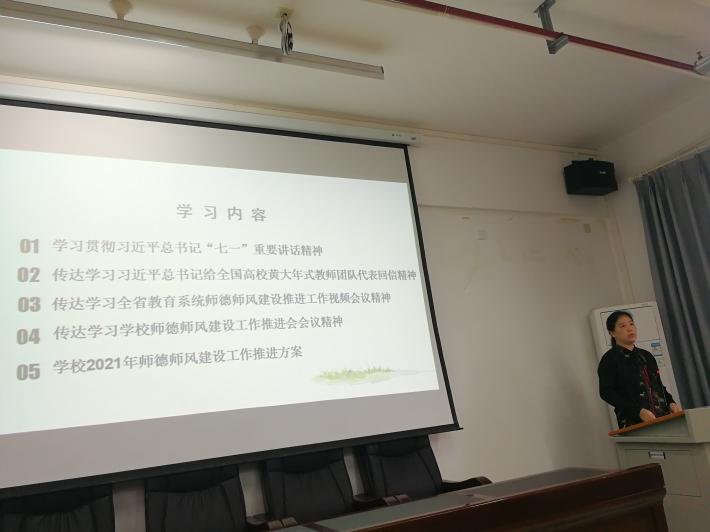 最后,学院党委副书记洪梅传达了学校相关会议精神,并带领教职工学习了习近平总书记“七一”重要讲话精神、习近平总书记给全国高校黄大年式教师团队代表回信精神、全省教育系统师德师风建设推进工作视频会议精神等。同时,对学院师德师风建设工作进行了部署,要求全体教职工真正把为学、为事、为人统一起来,当好学生成长的引路人。
