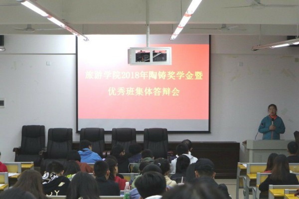 10月16日下午,旅游学院2018年陶铸奖学金暨优秀班级体答辩会在博文楼南905教室召开。旅游学院党委副书记洪梅、2015级辅导员彭湘宜老师、2016级辅导员肖晗老师、2018级辅导员曾浩老师出席本次答辩会,第十四届团委学生会主席团、各部门部长,2016级、2017级、2018级各班班委到场观看。本次会议由2018级兼职辅导员陈钰姝主持。