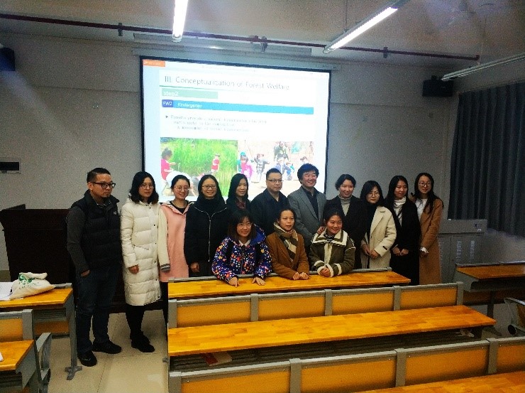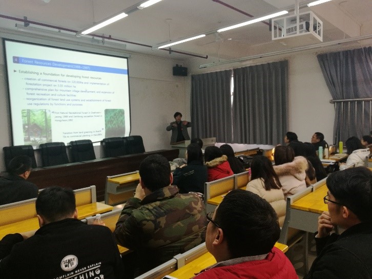 12月26日15:30,由韩国顺天大学Kye joong Cho教授主讲的“Policy directions of Forest Recreation and Conceptualization of Forest Welfare”学术讲座在文综楼南905举行。旅游学院数十名研究生及教师到场学习。
