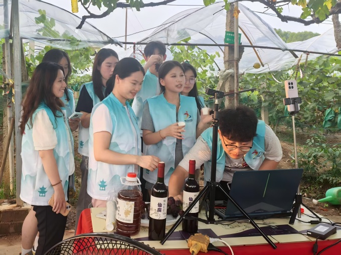 在仙庾镇柏春葡萄园,实践团成员架起直播设备,化身“带货主播”,宣传 “葡萄采摘+向日葵花海+荷花池观光”的乡村旅游路线,实现“农产品+文旅”双线推广。短短两小时的直播累计吸引4500余人次观看,收获点赞5.7万余次,有效提升了当地农产品的知名度。此外,团队成员还运用短视频创作、社交媒体推广等新媒体手段,帮助农户拓宽销售渠道。