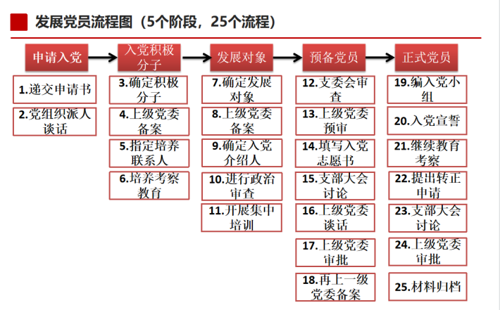 火宗乾同志对党员发展流程中的5个阶段和25个流程做了较为全面的介绍。党员发展的基本流程共分为五个阶段:申请入党、入党积极分子的确定和培养教育、发展对象的确定和考察、预备党员的接收、预备党员的教育考察和转正;其次是党员发展的25个流程:提交入党申请书、推荐和确定入党积极分子、确定发展对象、填写入党志愿书、入党宣誓等。