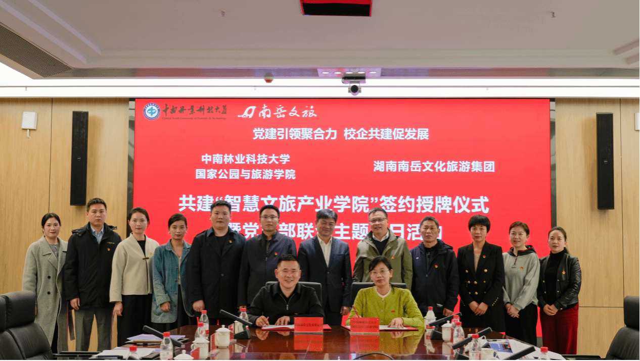 11月22日至23日,中南林业科技大学国家公园与旅游学院与湖南南岳文化旅游集团有限公司在南岳共同举行智慧文旅产业学院签约授牌仪式,并联合开展党支部主题党日活动。