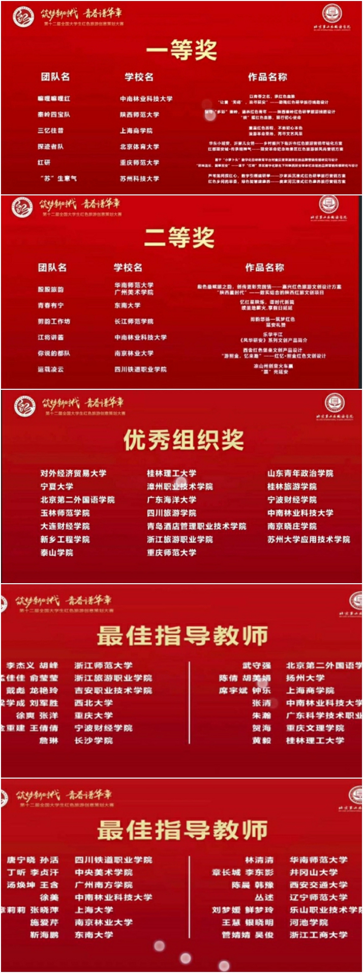 张清老师指导的嘛哩嘛哩红团队的作品《让爱“无碍”,逐梦韶山——助残红色研学旅行线路设计》和《让爱“无碍”,追寻延安——助残红色研学旅行线路设计》获得评委一致认可,并在颁奖典礼展播。