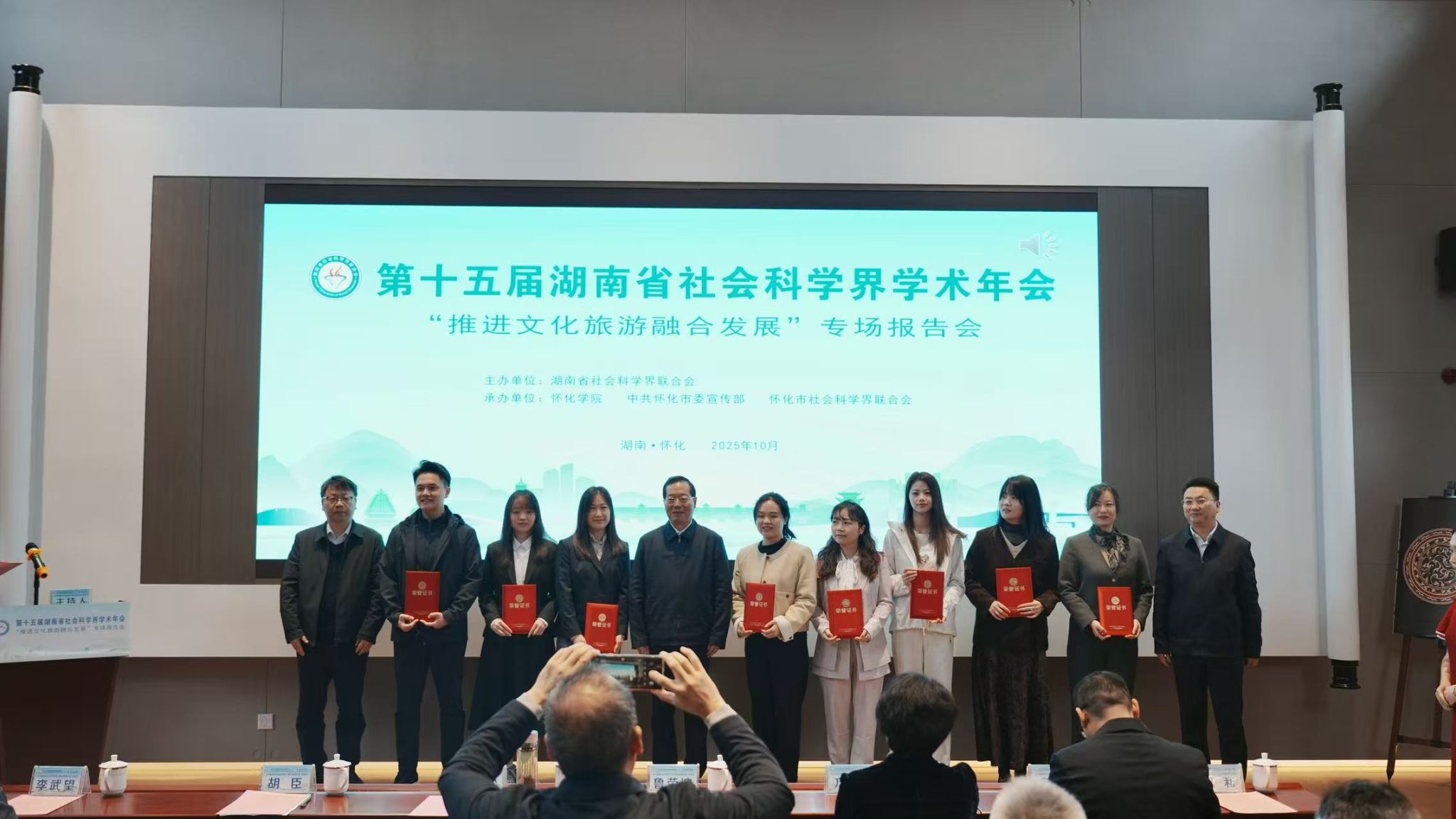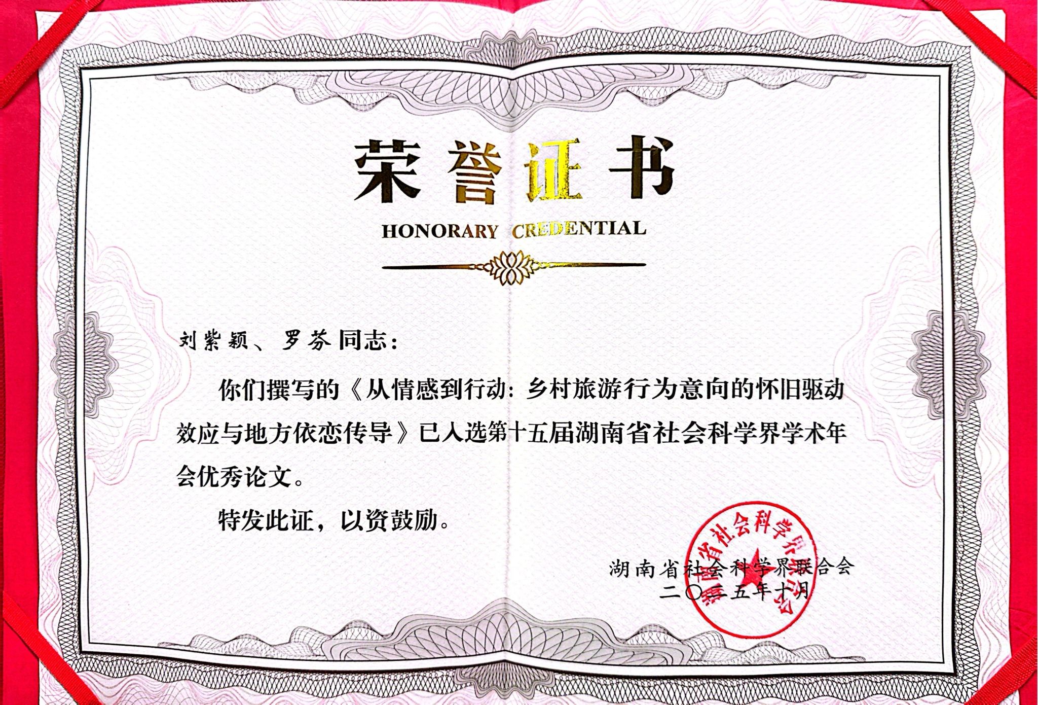 10月15日,湖南省社会科学界联合会发布了《关于入选第十五届湖南省社会科学界学术年会优秀论文的通报》。我院硕士研究生刘紫颖在导师罗芬教授的指导下,所撰写论文《从情感到行动:乡村旅游行为意向的怀旧驱动效应与地方依恋传导》成功入选,并受邀参与“推进文化旅游融合发展”专场报告会。省社科联党组书记、副主席胡代松,怀化市委常委、市委宣传部部长胡臣出席并致辞,领导高度重视哲学社会科学工作,号召广大社科工作者,以本届学术年会为新起点,更好担负起新时代文化使命,深入推进文旅融合发展,促进我省文旅事业高质量发展。
