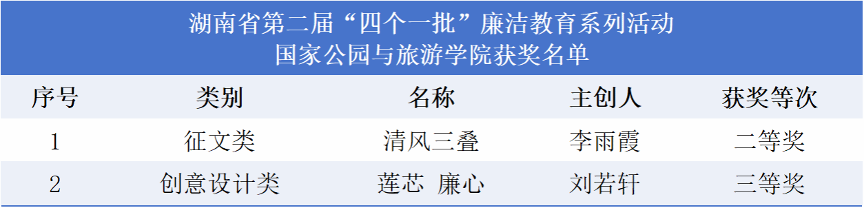 近期,湖南省教育厅公布第二届“四个一批”廉洁教育系列活动评选结果,我校荣获7项奖项,我院学生表现突出,其中:本科生李雨霞同学的征文类作品《清风三叠》荣获二等奖;本科生刘若轩同学的创意设计类作品《莲芯 廉心》荣获三等奖。